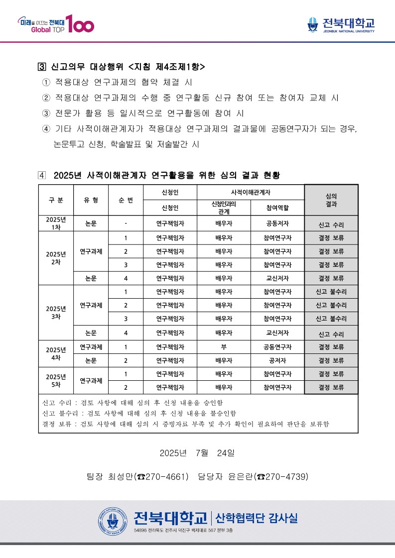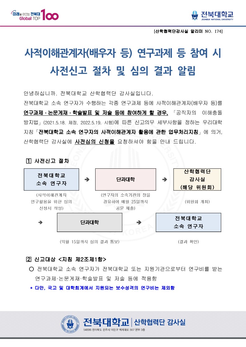 사적이해관계자 연구과제 등 참여시 사전신고 절차 및 심의 결과 알림 [산학협력단감사실 알리미 No. 174]