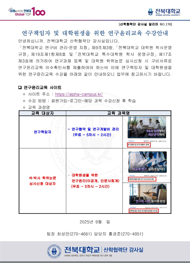 연구책임자 및 대학원생을 위한 연구윤리교육수강안내 [산학협력단감사실 알리미 No. 178]