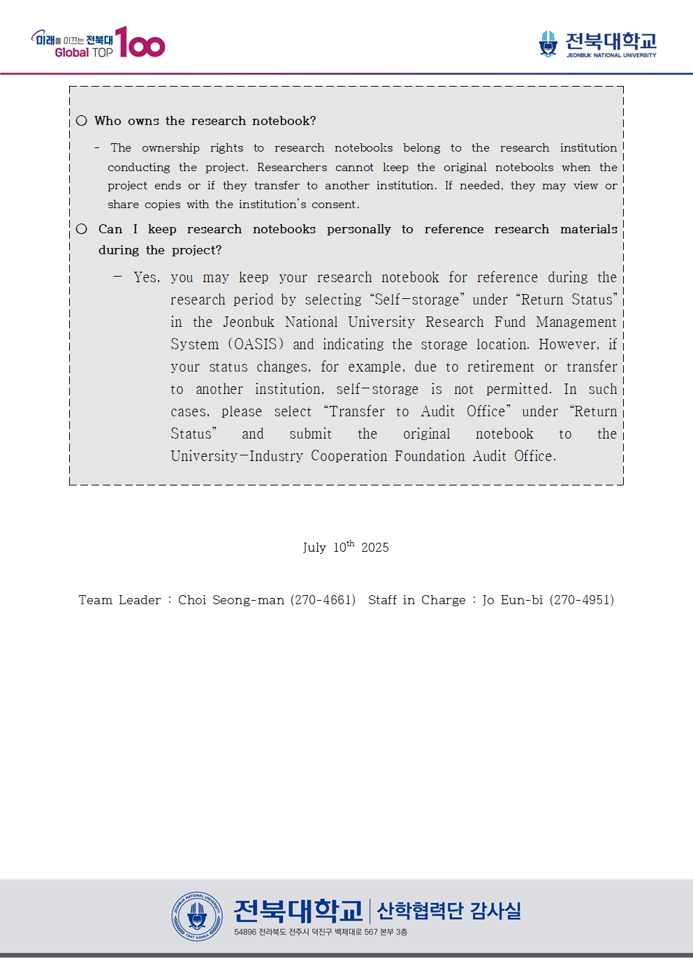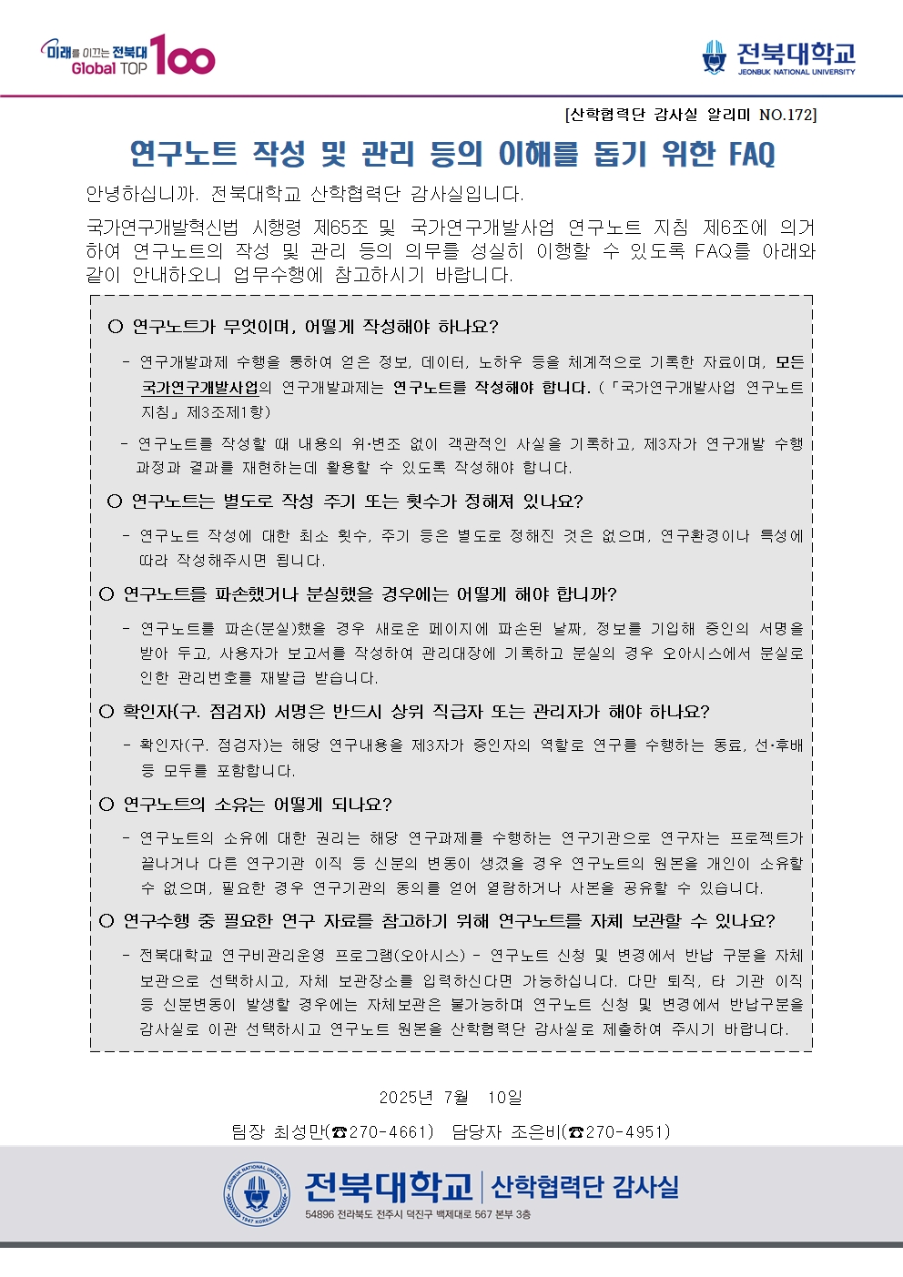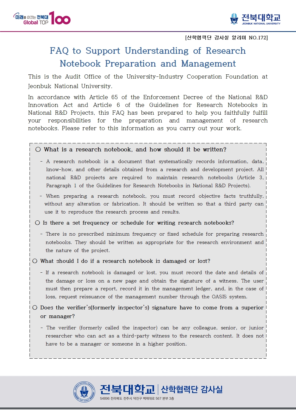 연구노트 작성 및 관리 등의 이해를 돕기 위한 FAQ [산학협력단감사실 알리미 No. 172]