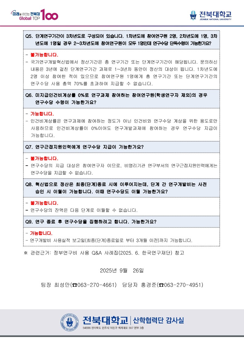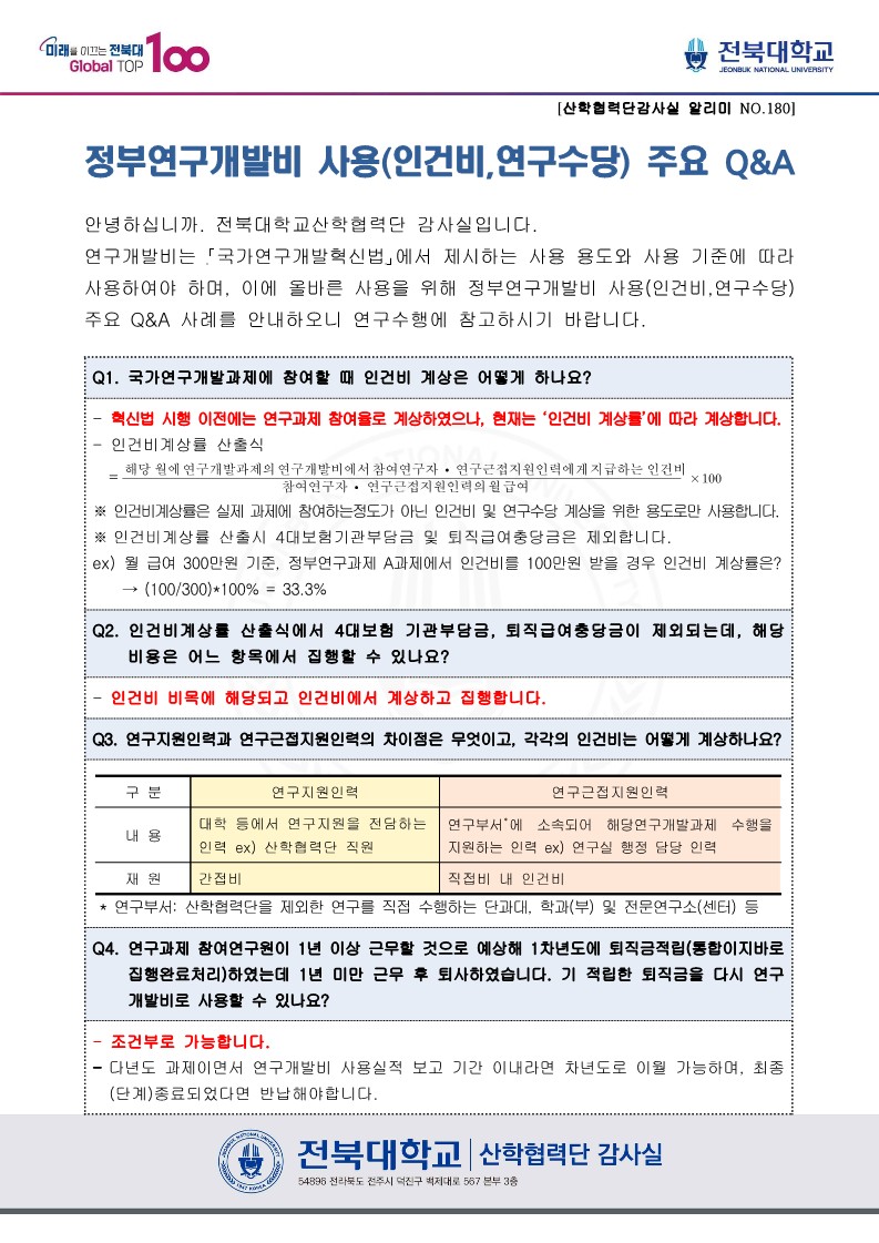 정부연구개발비 사용(인건비, 연구수당)주요Q&A [산학협력단감사실 알리미 No. 180]