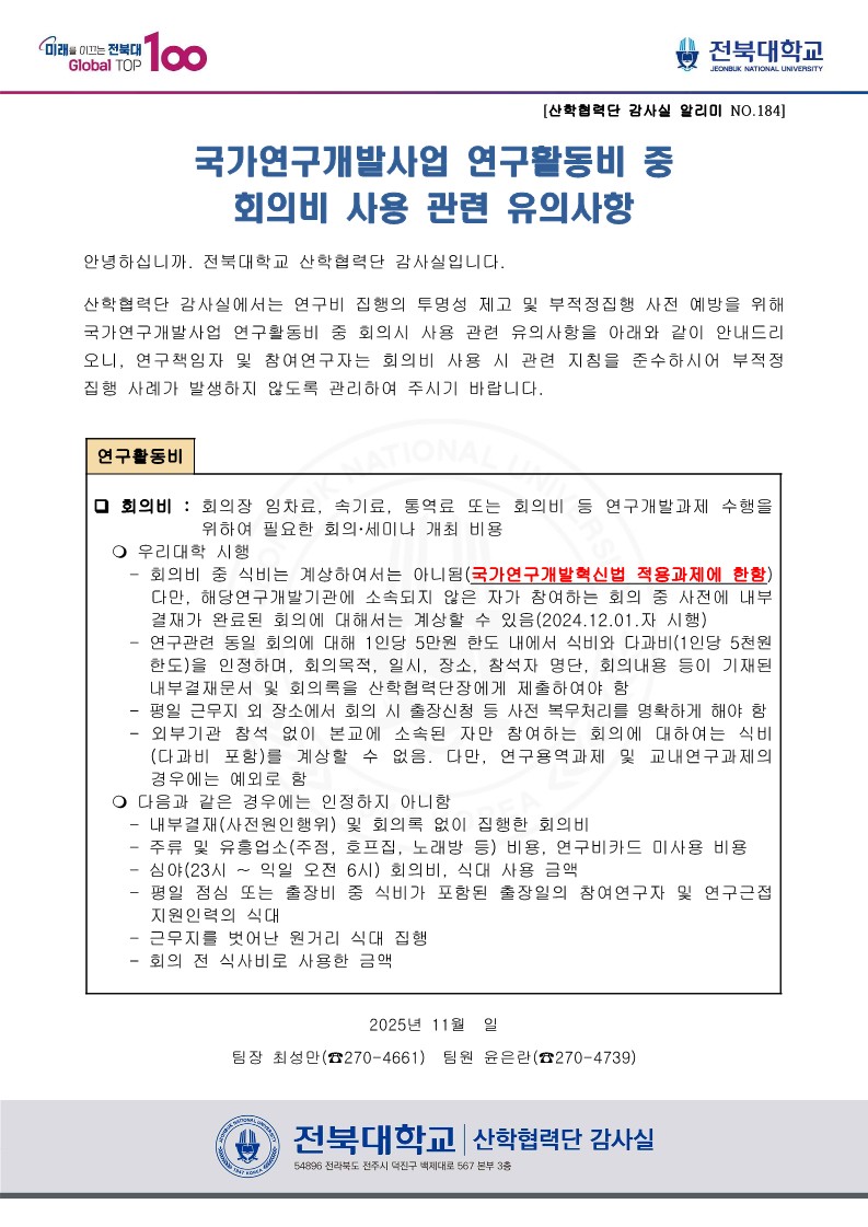 국가연구개발사업 연구활동비 중 회의비 사용 관련 유의사항(산학협력단 감사실 알리미 No.184)