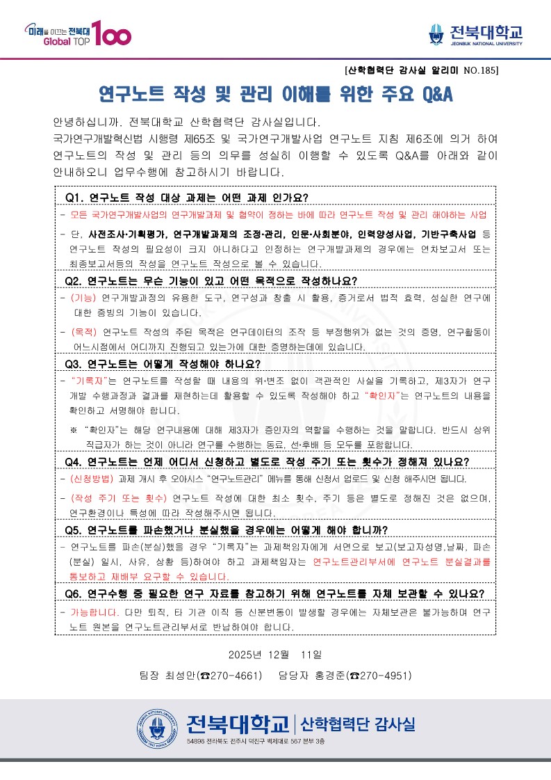 연구노트 작성 및 관리 이해를 위한 주요 Q&A(산학협력단 감사실 알리미 No.185)