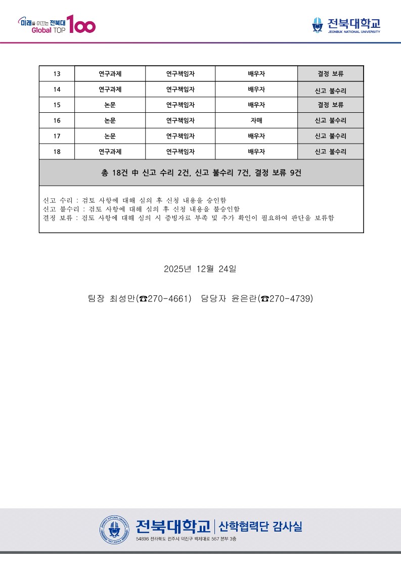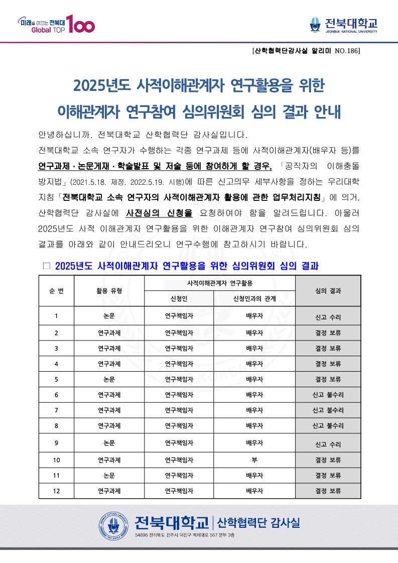 2025년도 사적이해관계자 연구활용을 위한 이해관계자 연구참여 심의위원회 심의 결과 안내(산학협력단 감사실 알리미 No.186)