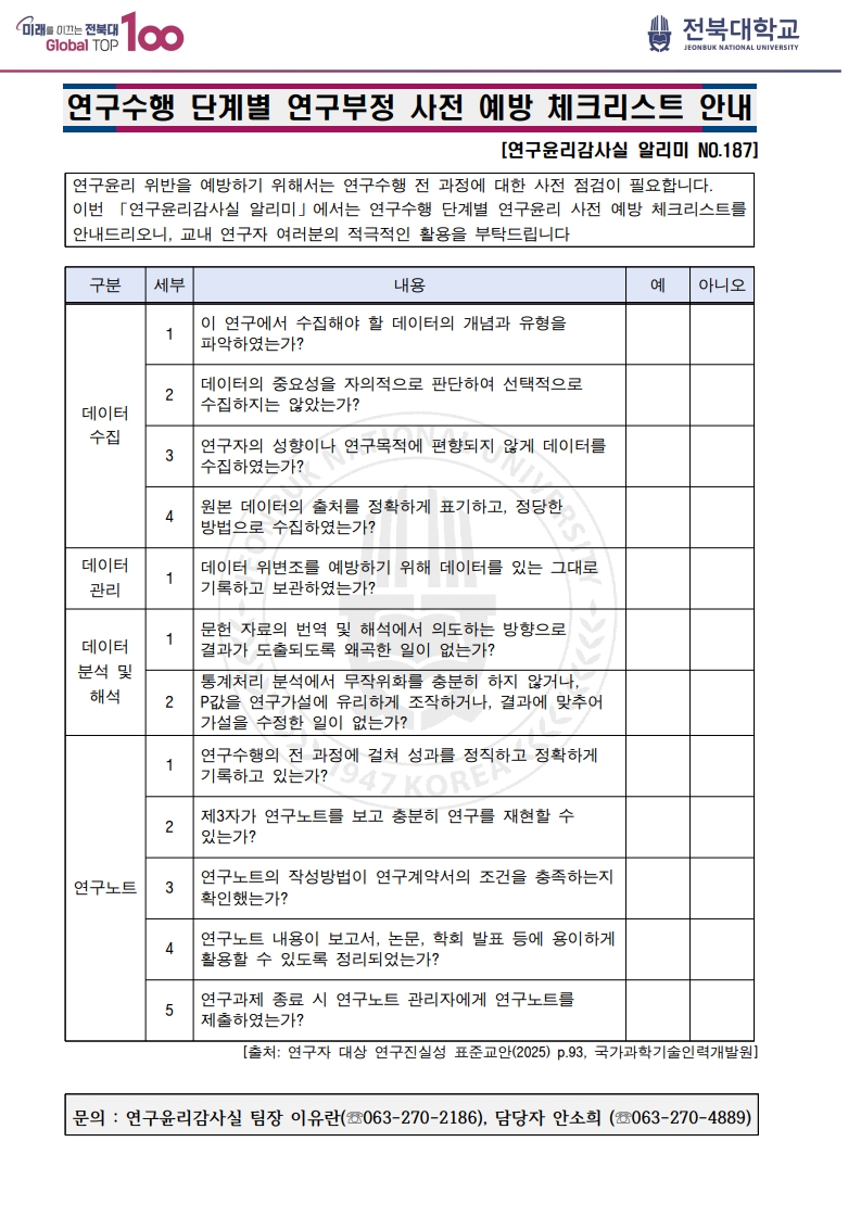 「연구수행 단계별 연구부정 사전 예방 체크리스트 안내」[연구윤리감사실알리미_No.187]