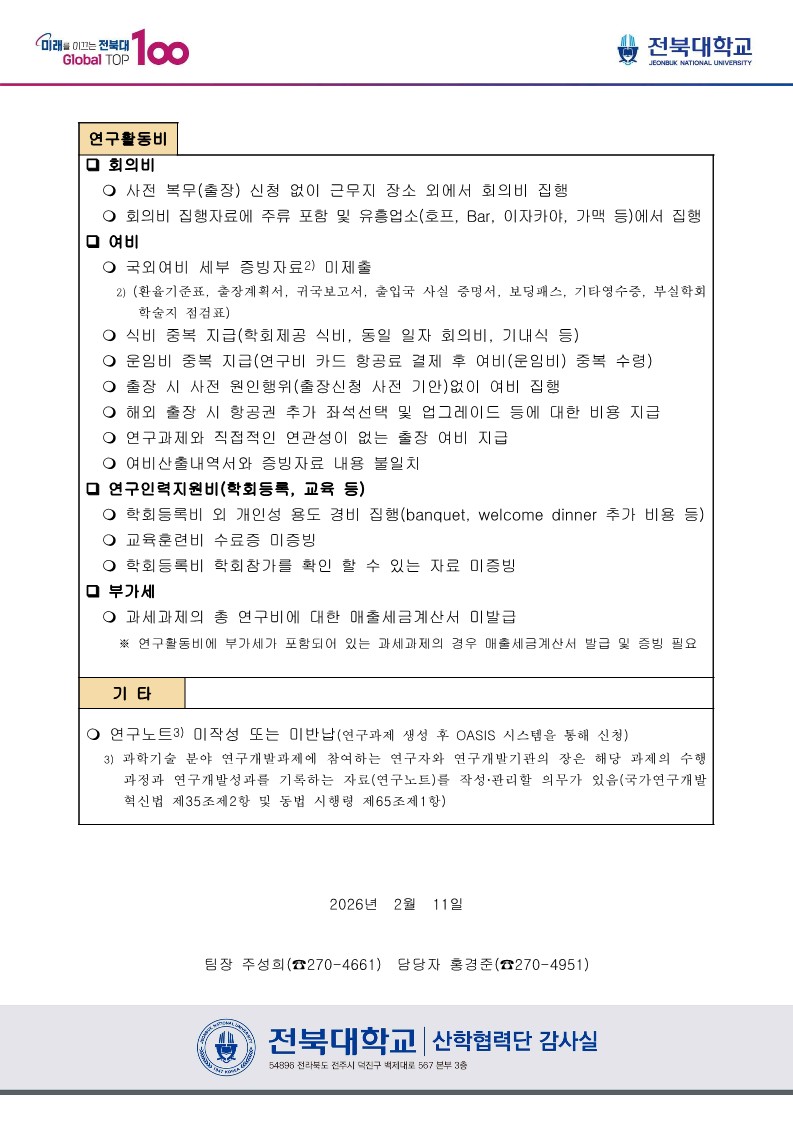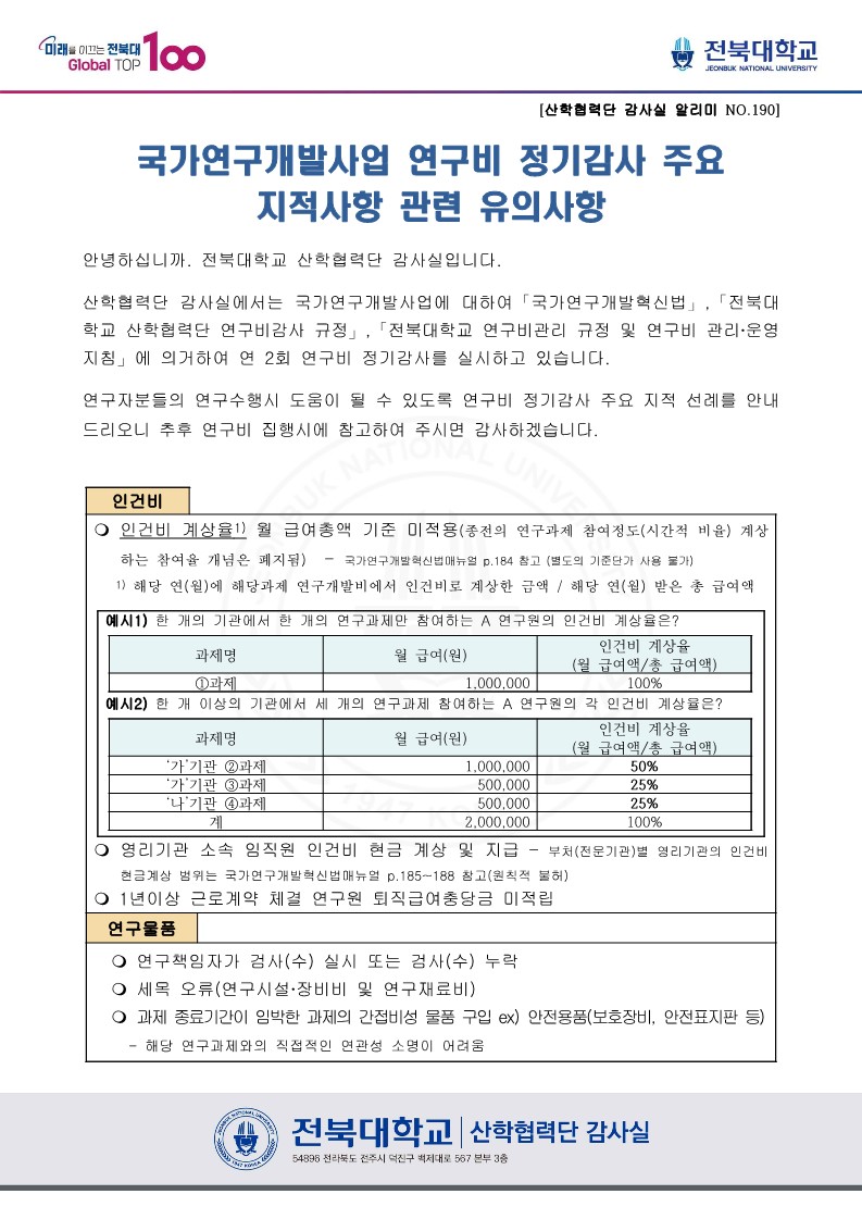 국가연구개발사업 연구비 정기감사 주요 지적사항 관련 유의사항[산학협력단 감사실 알리미 No.190]