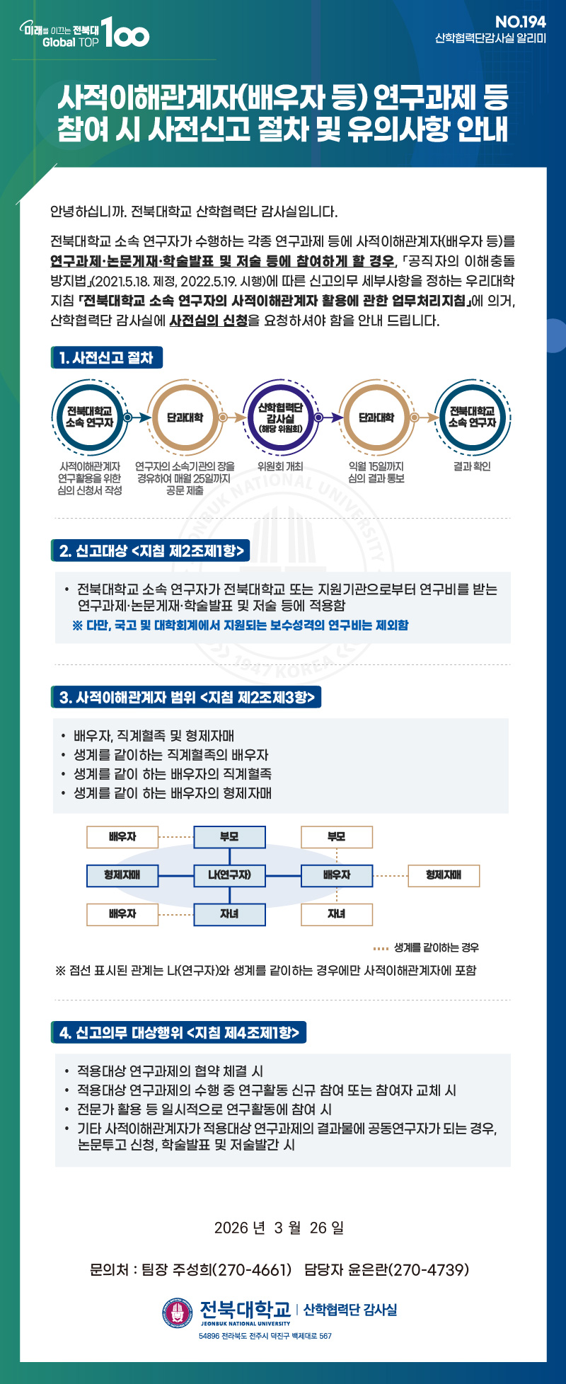 사적이해관계자 연구과제 등 참여 시 사전신고 절차 및 유의사항 안내[산학협력단감사실 알리미 No. 194]